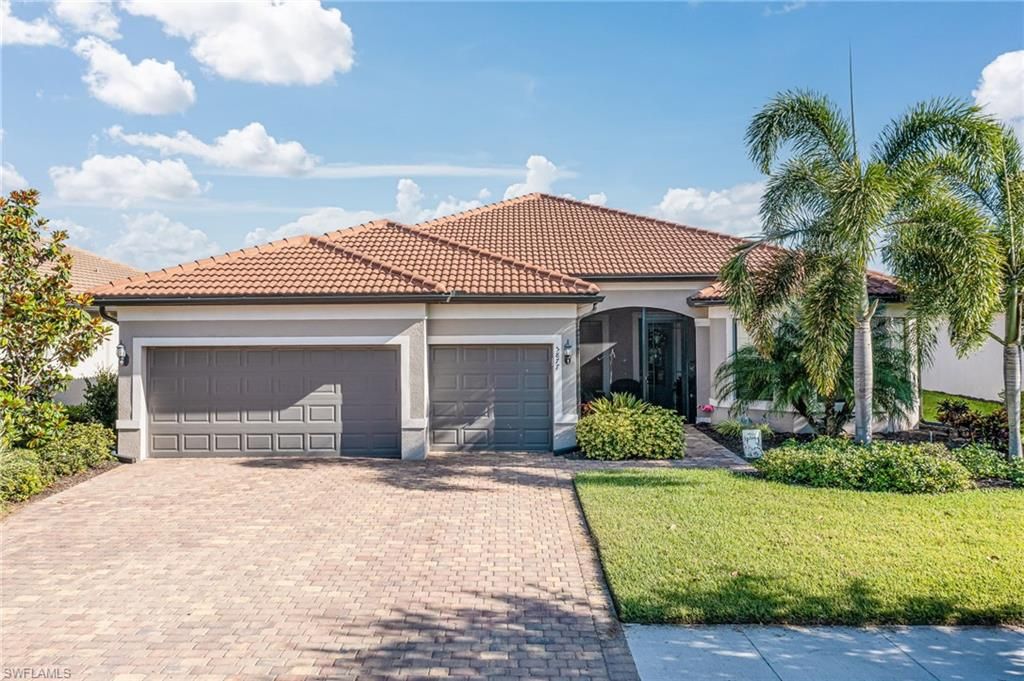 Welcome to this immaculate home in the sought-after Del Webb 55+ golf community, where luxury meets leisure. The Pinnacle floorplan offers 3 spacious bedrooms, 3 full baths, and a versatile den, all nestled on a serene cul-de-sac with beautiful lake views. Key Features include: Beautiful large plank floor tiles throughout the kitchen den and great room, window treatments for added privacy and screen-enclosed front entry and rear lanai, perfect for enjoying the outdoors. The heart of this home is a chef